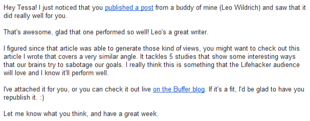 Voici un exemple : Je suis NOM de ENTREPRISE, j’adore ce que vous avez fait sur le blog X, ce récent article sur Y était super, j’ai mis en œuvre beaucoup de vos conseils dans mon projet.