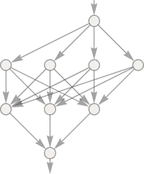Revenons au réseau de neurones. Un réseau de neurones, ça ressemble au schéma ci-dessous. On y voit des neurones, organisés en couches. Chaque neurone est connecté à tous les neurones de la couche précédente et de la couche suivante.