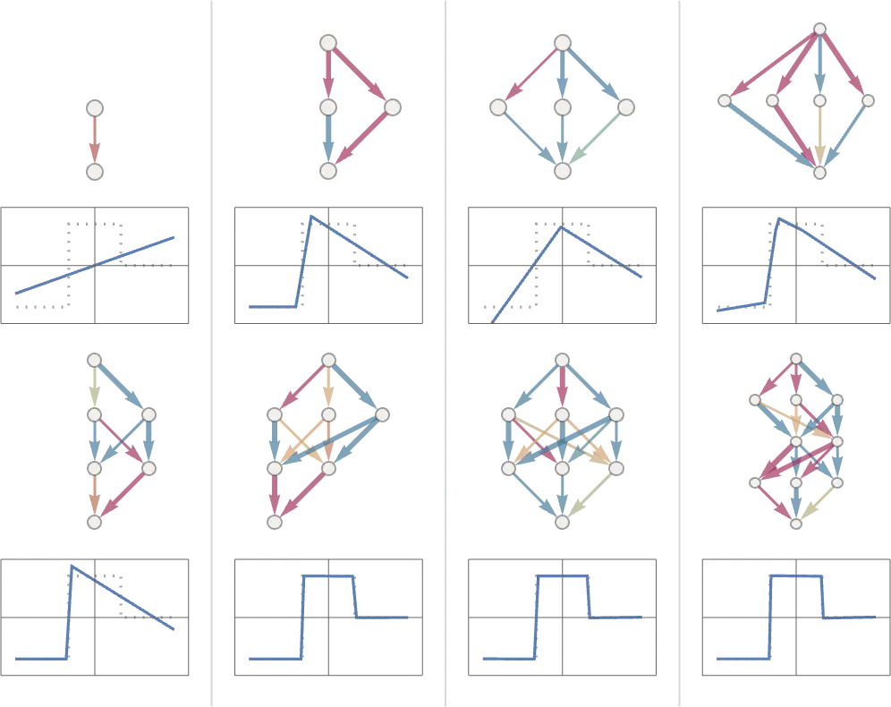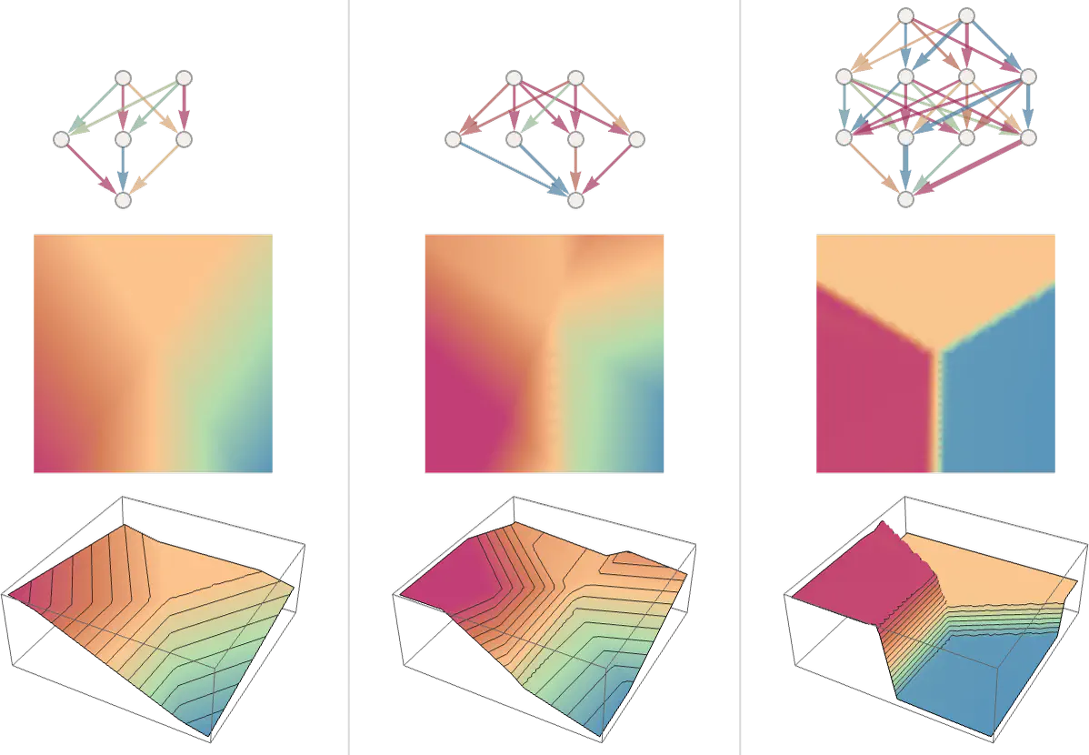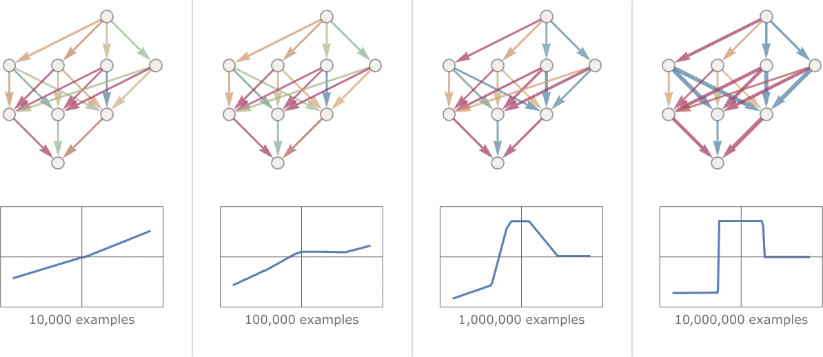 Généralement, plus le réseau est gros, plus il est capable de faire une approximation précise de la fonction que nous recherchons comme on peut le voir ci-dessous.