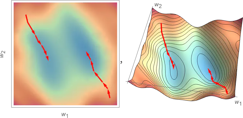 Imaginons un instant que l’on ait deux poids w1 et w2 et que l’on ait une fonction de perte qui ressemble à cela :