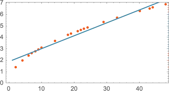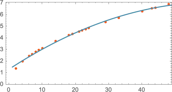La ligne droite donne un résultat qui est assez proche de la réalité, mais il y a des points qui sont un peu loin de la droite. En essayant une formule mathématique plus compliquée (a + b x + c x2), on arrive à quelque chose de mieux, c’est-à-dire plus proche de la réalité :