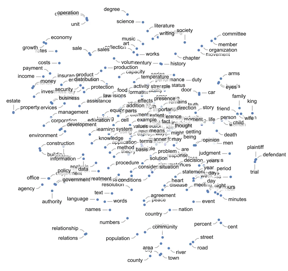 On peut voir cela comme une tentative de représenter un “espace de signification” dans lequel les mots sont placés sur une carte les uns à proximités des autres en fonction de leur signification. Si on essayait de faire une carte en seulement deux dimensions, cela donnerait ça :