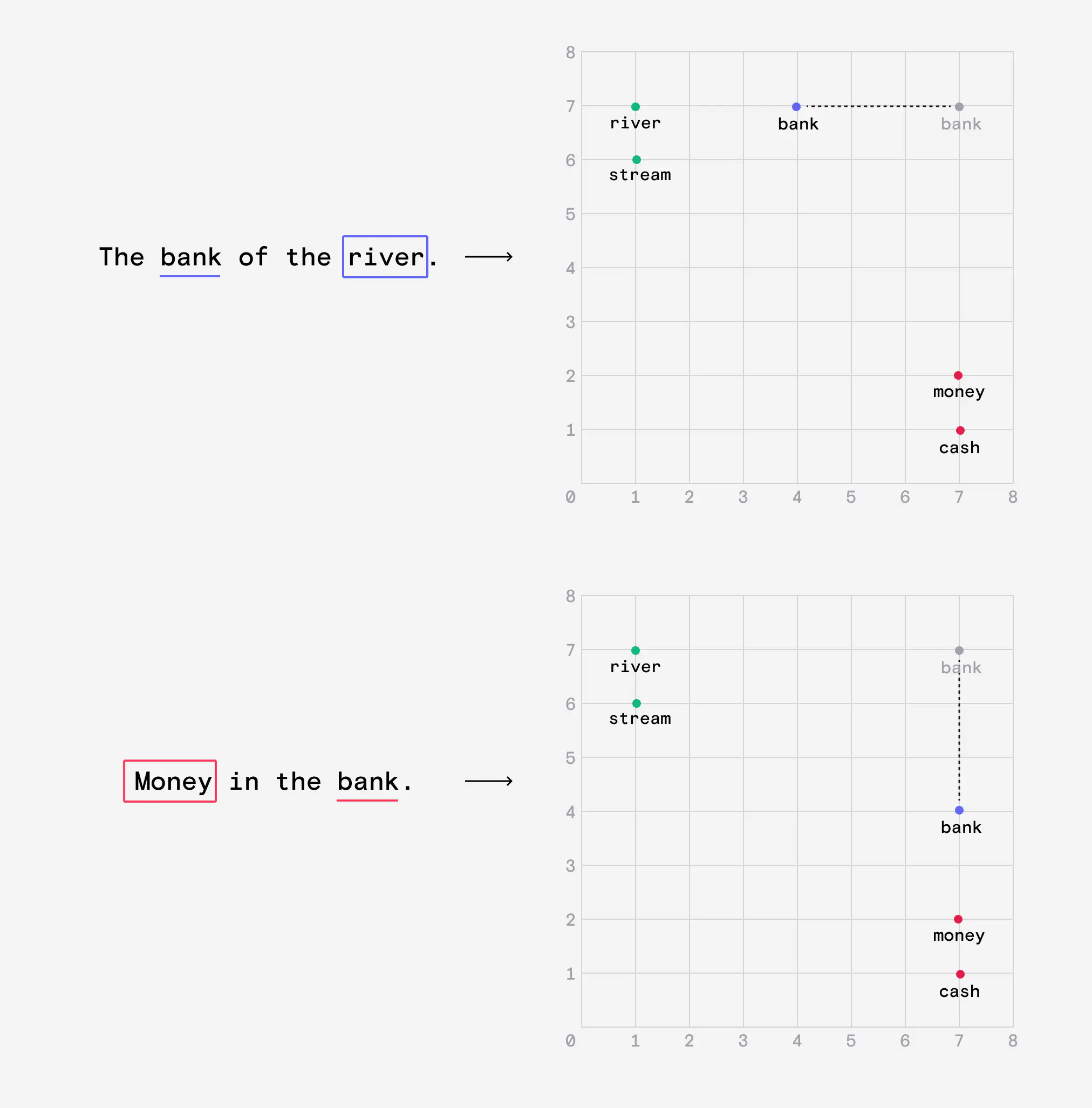 Le schéma ci-dessous montre le fonctionnement des transformers avec deux phrases “the bank of the river” et “money in the bank”. On peut voir que le mot “bank” est déplacé grâce aux autres mots de la phrase.