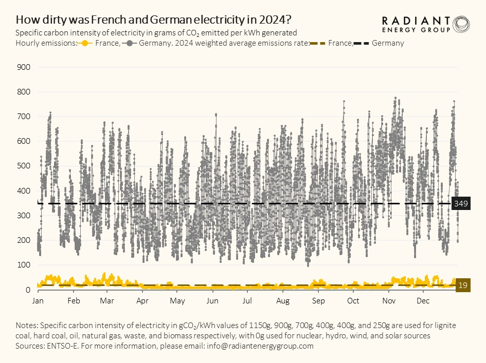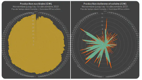 Le gros problème de l’éolien et du solaire est que ce ne sont pas des sources d’énergie pilotables ce qui fait qu’un soit d’hiver où il n’y a pas de vent, vous vous retrouvez sans rien… et vous devez donc démarrer une source d’électricité pilotable comme le nucléaire en France ou le charbon et le gaz en Allemagne.
