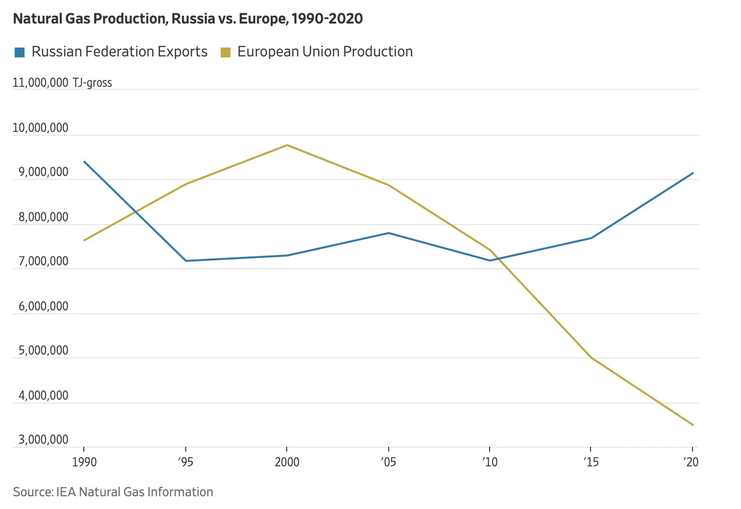 La majorité de la population pense que l’Europe dépend de la Russie pour l’énergie parce qu’elle n’a pas de ressource, mais il y a 15 ans, l’Europe exportait plus de gaz naturel que la Russie aujourd’hui. Aujourd’hui, la Russie exporte 3 fois plus de gaz que l’Europe n’en produit.