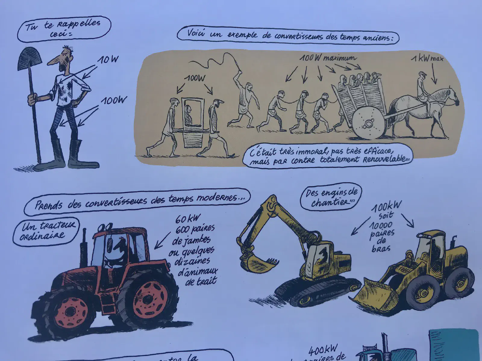 Jancovici rappelle que pour remplacer l’agriculture mécanisée, il faudrait la force cumulée de 600 personnes ou 60 chevaux de trait pour obtenir la même puissance qu’un seul tracteur.
